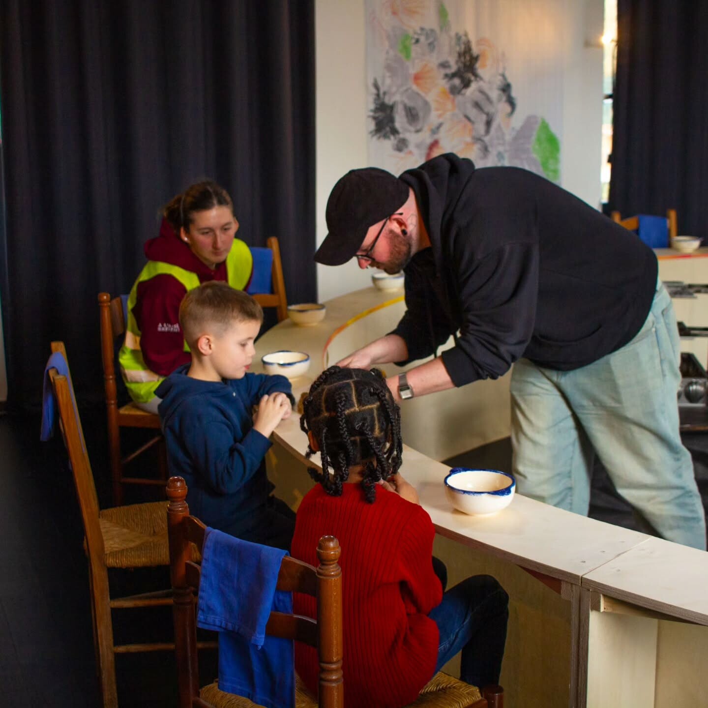 Suite à la découverte de l’exposition et guidé·es par l’équipe de La Gare, les participant·es ont joué avec les couleurs, les formes découpées et les ingrédients pour cuisiner leur repas préféré.